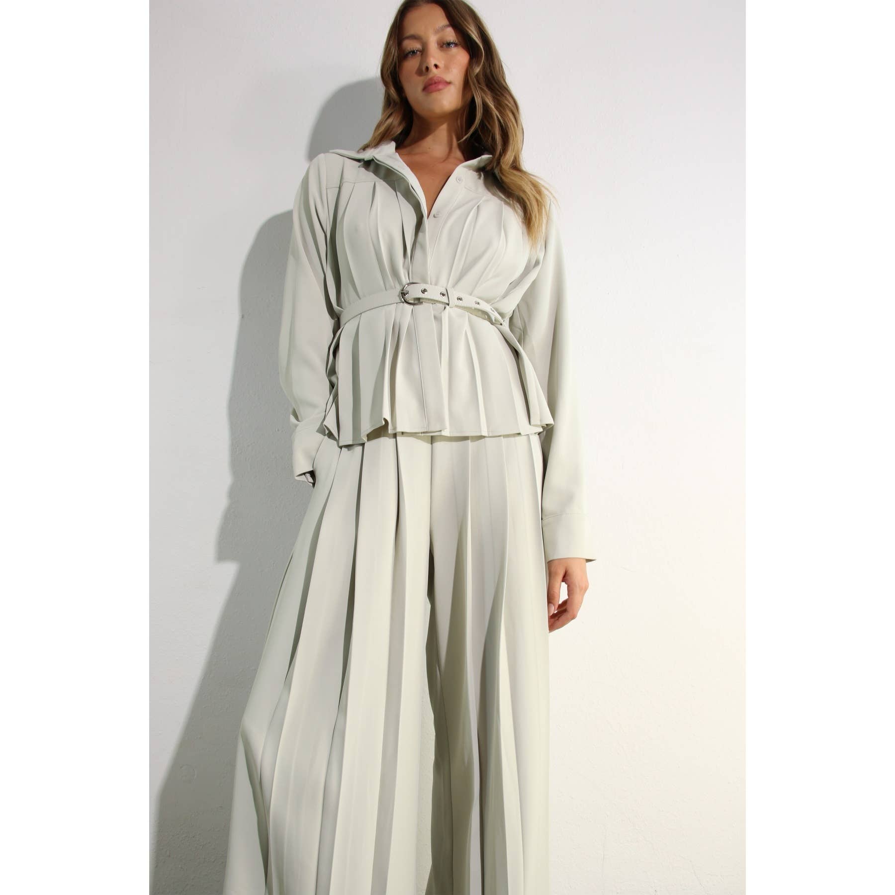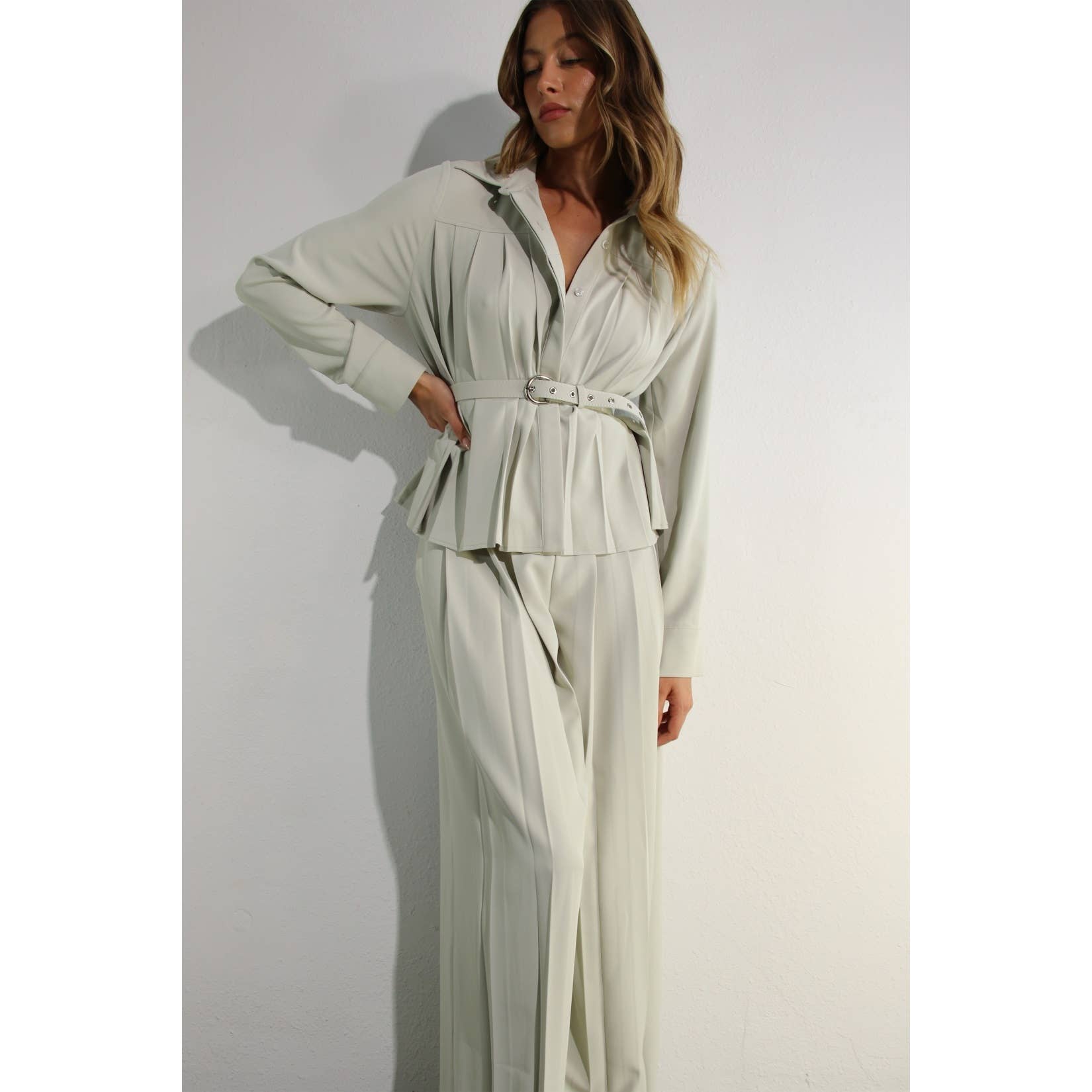 Style: PLEATED SHIRTS TOP AND PLEATED PANTS SET BELT INCLUDED Model US 2, height:5'8' bust:34 C CUP waist:26 hips:34 SHE IS WEARING OUR SIZE SMALL 100%POLYESTER